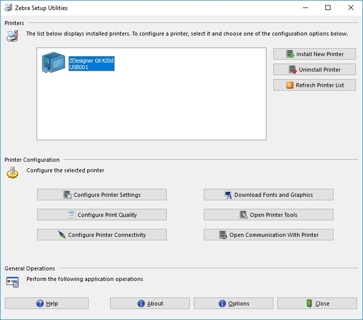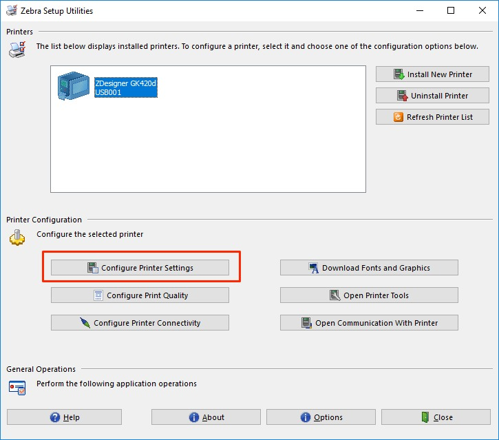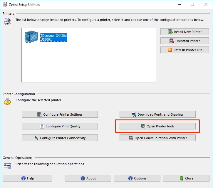 In the Zebra Setup Utilities application, select the Zebra printer you want to calibrate.