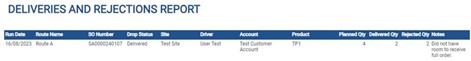 There is a new report, Deliveries and Rejections, which has been designed to keep track of deliveries that have been carried out and whether and why any of stock shipped had to be rejected by the customer. The report can be filtered by Site, Product and the dates the transport run was carried out: