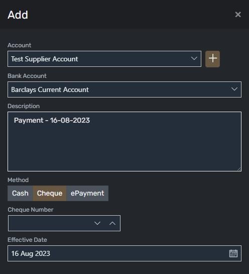 Check (Cheque) Printing is now available in Cloud. To create a Cheque to be printed a payment record must be added in Bank Payments, selecting the relevant Account to be paid and setting the method of payment as Cheque, a Cheque Number can optionally be added at this stage: