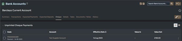 Once the relevant items to be paid are added to the transaction, and it is finalised, the Unprinted Cheque will be displayed on the Cheque tab of the Bank Account: