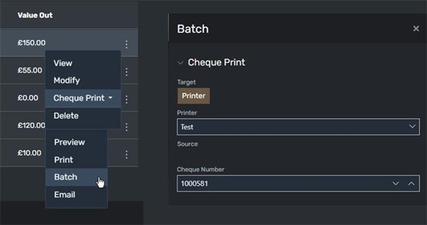 From here, one or more Unprinted Cheques can be selected and Batch Printed. The Cheque Number can also optionally be entered at this stage, with the number sequentially allocating to any cheques that have not had a Cheque Number set at the initial stage of entry. Processing here will queue the cheques with the selected paired printer: