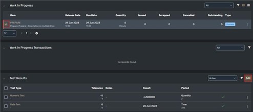 Once Test Types have been assigned to a Process or Product they can be used to record Test Results. For a Process, these will be logged in during manufacturing. On a Manufacturing Order, selecting the WIP line for a Process with Test Types assigned enables the Add button in the Test Results panel at the bottom of the screen and any previously entered test results are displayed: