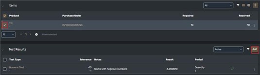 Test Results for a Product can be recorded in two places, primarily when receiving goods. Selecting a line item on a Goods Receipt will enable the Add button for the Test Results panel, and again, previously added results can be seen: