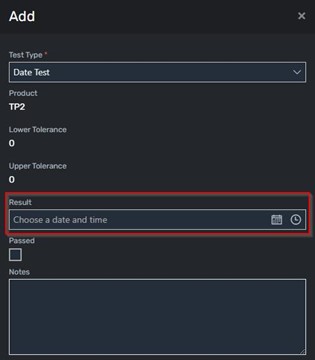 When adding test results you will need to select the test type, the Data Type of which will determine how you enter the test result. e.g. when the Data Type is set to Date: