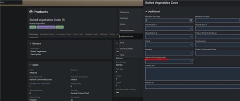On the additional info tab on a Product, there is a new field where a MO Prefix can be added. This is so that when an MO is created, this Prefix is used instead and not another or standard Prefix used for every other MO.