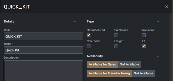 The Product will not actually be manufactured but simply represents a pre-defined “kit” of components to be collected and shipped to a customer. A kit can be defined either by specifying the components on its Structure or by setting up a Configurator for the product. The kit will appear on a Sales Order as normal, when added.