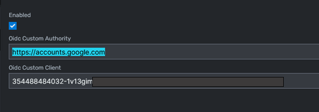 - Set the authority to “https://accounts.google.com” and paste the client ID into the Client value. To enable the custom authority tick the Enabled box and then click Save.