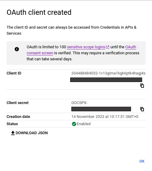 - Select OAuth consent screen, select External and click Create. Fill in the mandatory values and then click Save And Continue until you get back to the dashboard.